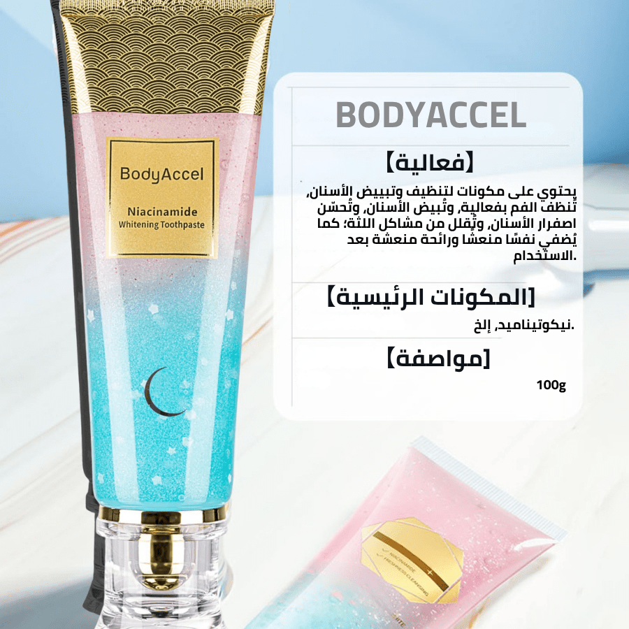 بصراحة، معجون BodyAccel من أفضل الخيارات اللي أنصح فيها للي يبغى تبييض يومي بدون ما يضر المينا أو يحسس اللثة، فيه نياسيناميد، وبدون فلورايد، وتنظيفه فعّال ولطيف بنفس الوقت.